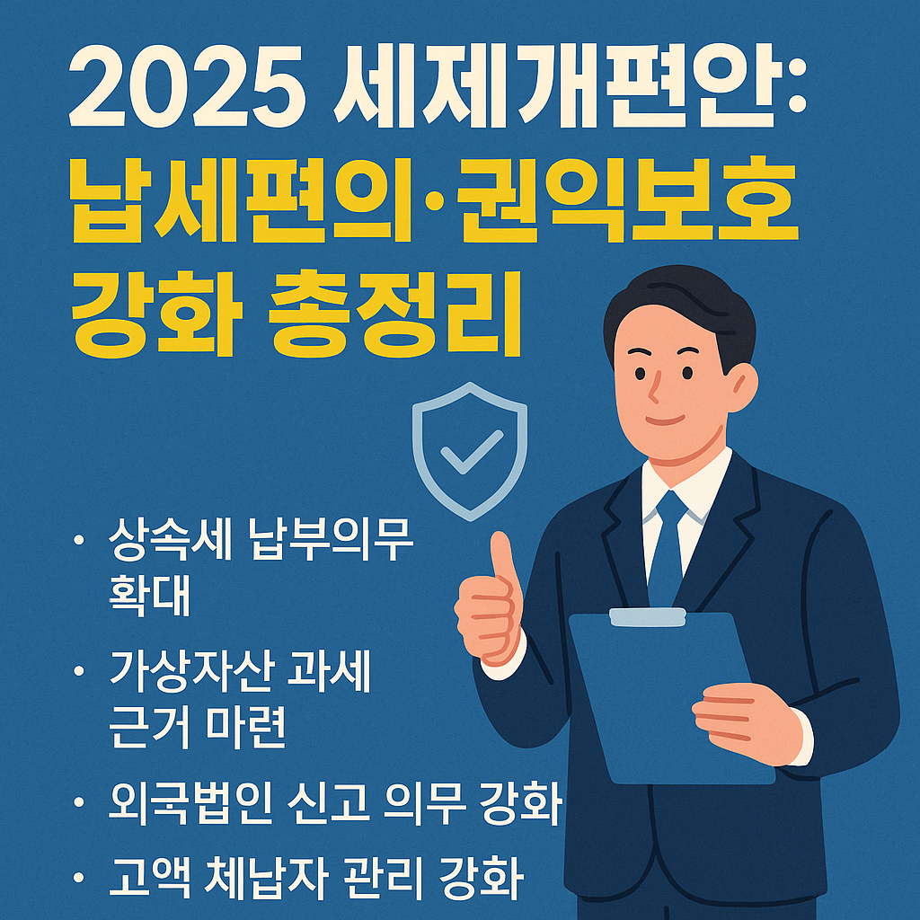 2025년 세제개편안은 납세자의 권익을 지키면서도 조세탈루를 방지하고 세정 신뢰를 높이는 방안을 포함했습니다. 상속세 납부의무 확대, 외국법인 신고 의무 강화, 가상자산 과세 근거 마련 등이 주요 내용입니다.