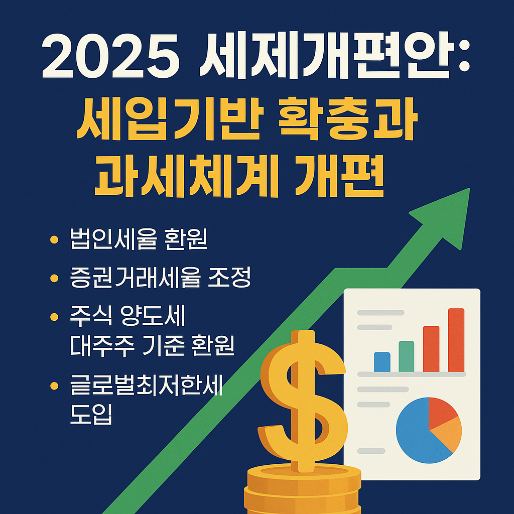 2025년 세제개편안은 법인세율 환원, 증권거래세율 조정, 글로벌최저한세 도입 등 세입기반을 확충하고 과세체계를 합리화하는 내용을 담고 있습니다.
