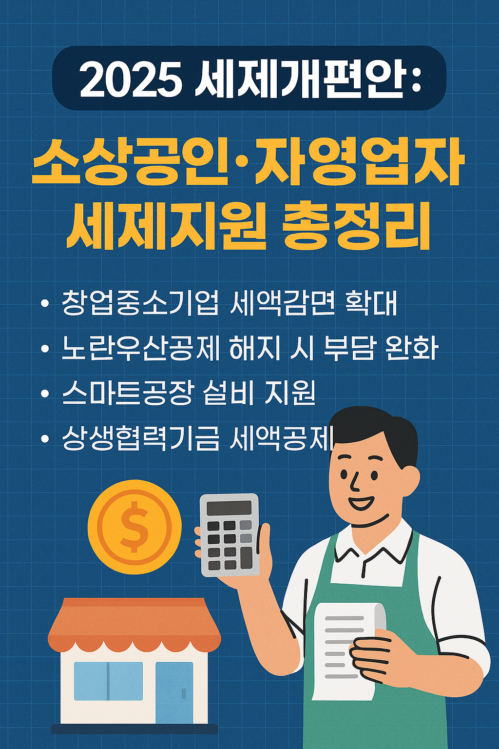 2025년 세제개편안은 창업중소기업 세액감면 확대, 노란우산공제 해지 시 세부담 완화, 스마트공장 설비 지원 등 소상공인과 자영업자를 위한 세제혜택이 강화되었습니다.