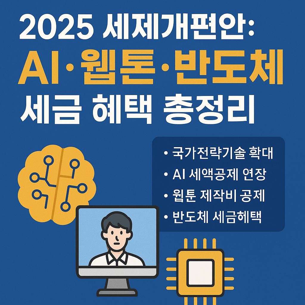 2025년 세제개편안에서 AI, 반도체, 웹툰 등 미래전략산업에 대한 세액공제와 지원 제도가 대폭 확대됩니다. 국가전략기술·사업화시설 확대, 웹툰콘텐츠 세액공제 신설 등 주요 변화를 한눈에 정리합니다.